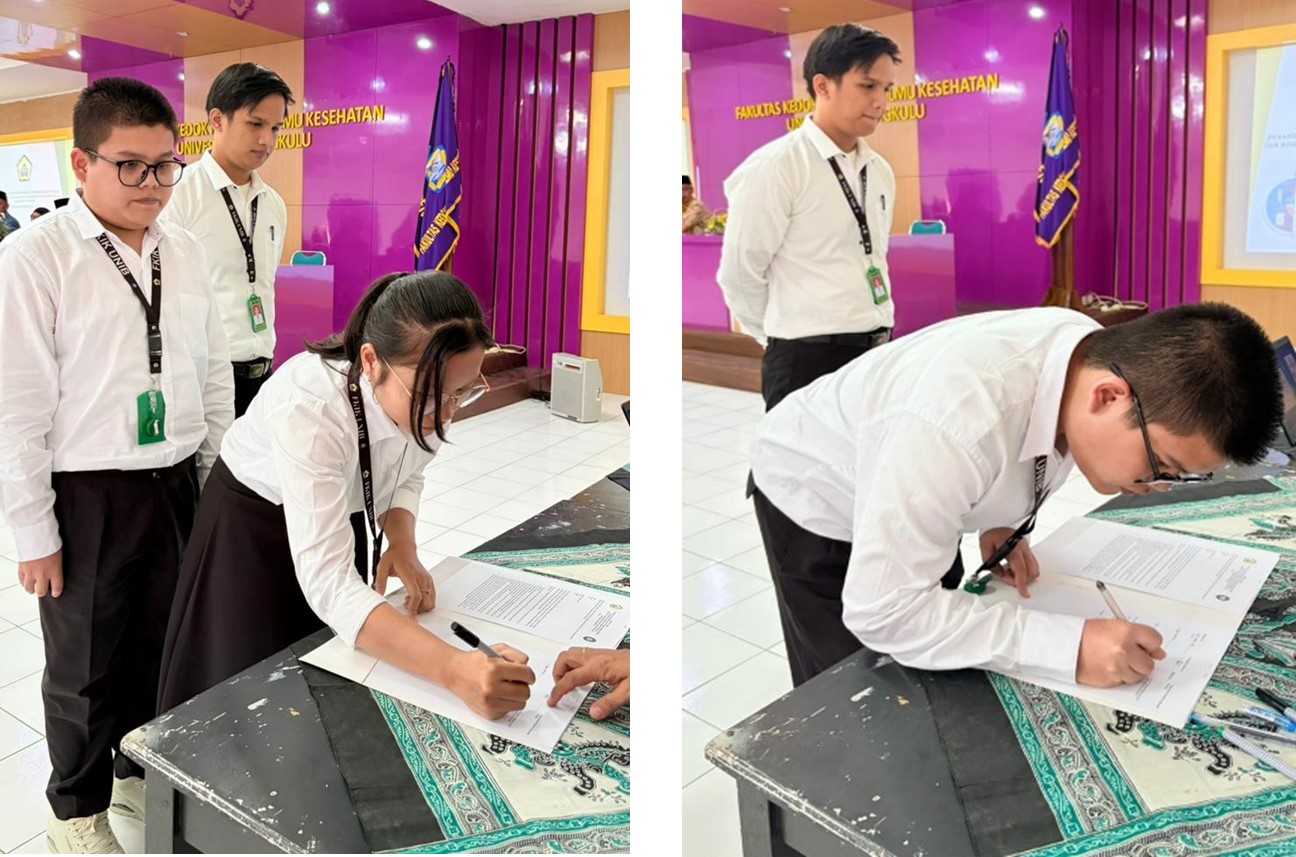 Rangkaian acara kemudian dilanjutkan dengan penandatanganan berita acara Sumpah Kepaniteraan oleh mahasiswa dan saksi. Saksi dalam kegiatan ini meliputi Dekan FKIK UNIB, Wakil Direktur Pelayanan Medik RSUD M. Yunus (dr. Widyawati, Sp.PD, FINASIM, CHMC.), serta Kepala Seksi Pendidikan dan Pelatihan RSHD Kota Bengkulu (Hendra, SKM.). Penandatanganan tersebut menjadi bentuk pengesahan komitmen bersama antara mahasiswa, fakultas, dan rumah sakit pendidikan dalam menjalankan proses pembelajaran klinik secara profesional dan bertanggung jawab. Melalui kegiatan ini, diharapkan integritas, etika, dan komitmen mahasiswa Program Studi Pendidikan Profesi Dokter semakin kuat, sehingga mereka mampu memberikan pelayanan kesehatan yang aman, bermutu, serta berorientasi pada keselamatan dan kesejahteraan pasien. [KED-DS]